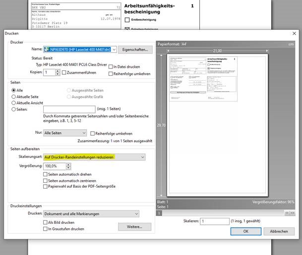 - Bei „Skalierungsart“ auf „Auf Drucker-Randeinstellungen reduzieren“ wählen