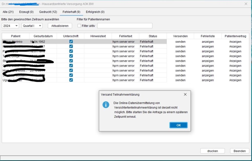 HzV Teilnahmeerklärungen werden nicht versendet. Es erscheint die Meldung hpm server error